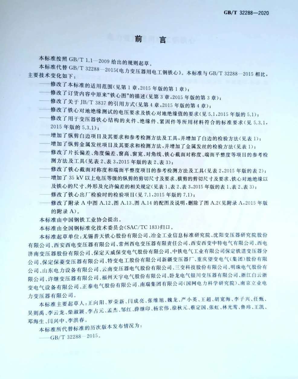本次《電力變壓器用電工鋼鐵心》GB∕T 32288-2020新國標由國內(nèi)與之相關(guān)的有影響力的多家特高壓、超高壓企業(yè)單位一起參與制定。