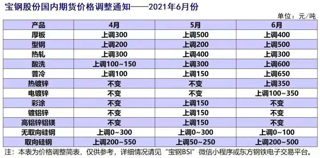 經(jīng)研究決定,寶鋼股份碳鋼內(nèi)銷價格2021年6月份在5月份基礎(chǔ)上調(diào)整公告如下(以下除特殊注明外,均為不含稅):