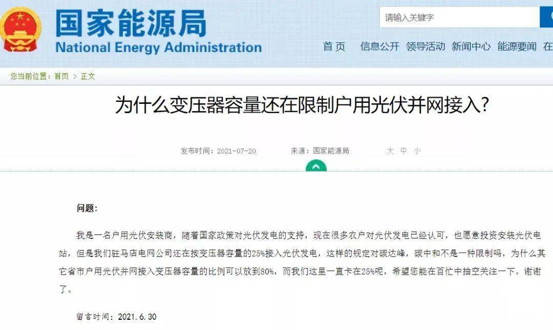 我是一名戶用光伏安裝商,隨著國家政策對光伏發(fā)電的支持,現(xiàn)在很多農(nóng)戶對光伏發(fā)電已經(jīng)認可,也愿意投資安裝光伏電站,但是我們駐馬店電網(wǎng)公司還在按變壓器容量的25%接入光伏發(fā)電,這樣的規(guī)定對碳達峰,碳中和不是一種限制嗎,為什么其它省市戶用光伏并網(wǎng)接入變壓器容量的比例可以放到80%,而我們這里一直卡在25%呢,希望您能在百忙中抽空關注一下。謝謝了。